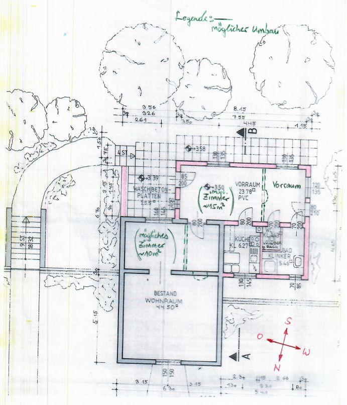 Es gibt einen großen sonnigen Naturgarten. Beheizt wird das Einfamilienhaus, welches im Grunde einen Bungalow darstellt über einen Holzofen. Die Betriebskosten liegen laut der Eigentümer bei ca. 190 Euro monatlich. Der Wohnraum könnte durch vorteilhaftere Aufteilung der Räumlichkeiten auch anders gegliedert werden. (Siehe grüne Schrift).